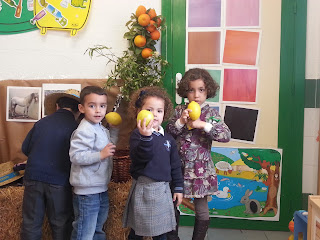 Hoy ha sido un día de lo más colorido en nuestra clase. Para empezar hemos empezado trabajando el color azul, bajo la atenta mirada de algunas de sus mamás que nos han acompañado. Y como se nos da bien eso de los colores, decidimos jugar también con el naranja. Y que mejor que preparar unos ricos zumos con las naranjas que nos ha traido de su huerto la mamá de Carmen (y nuestra propia granja que tiene un naranjo bien cargadito). Después de examinar las naranjas (su olor, tacto, forma, textura...) cortamos las naranjas y, exprimidor en mano, hemos preparado unos zumos muy ricos. Para completar la actividad, hemos realizado una actividad plástica, en la cual había que decorar una naranja con plastilina. En fin, que ha sido un día de lo más sabroso. ¡Qué ricas naranjas! Aunque a algunos hoy ha sido un día muy largo porque eso de tomar zumo de naranja recién exprimido le ha costado un mundo.