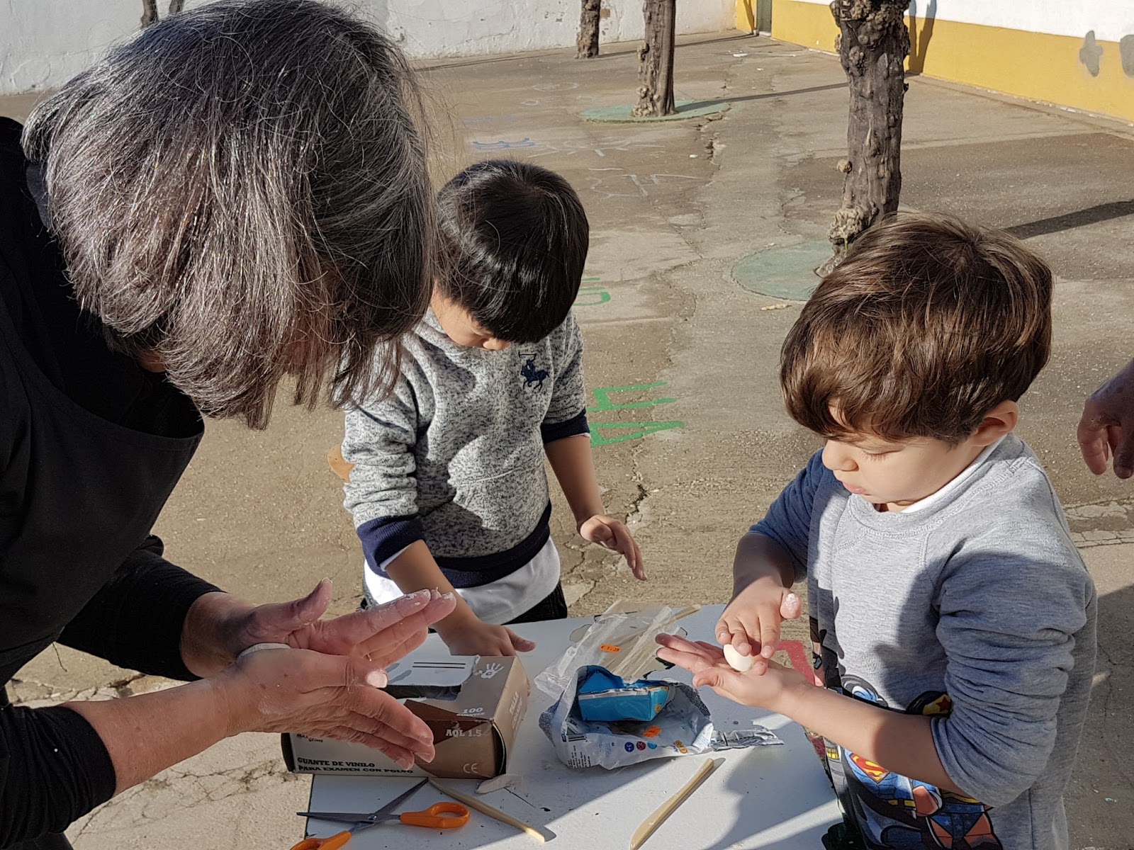 Hoy hemos contado con la inestimable ayuda de los abus de José Antonio, Pepe y Manoli, que nos brindado su tiempo y experiencia para realizar un taller de elaboración de esculturas muy particular. Por una parte realizamos con su ayuda una pieza en arcilla blanca con vistas a San Valentín. Y por otro lado, con prendas que ya no nos valen las escayolizamos para preparar una exposición de esculturas para el día de la Paz. El hecho de ensuciarnos, meter las manos en ese engrudo, ver nuestras prendas con ese color grisáceo, como se endurecían y vivenciar todo el proceso de transformar un objeto cotidiano en una obra de arte ha hecho que esta actividad nos enriqueciera a todos y todas. Gracias a los abus que aportaron todo el material y su ilusión para estar con los peques.