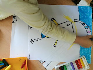 Y tras el desayuno un dibujo formato a3 de nosotros mismos disfrazados.